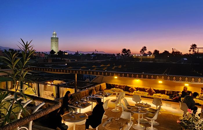 Située au cœur du quartier Mouassine, cette vaste terrasse est une institution. Très spacieuse, elle permet de profiter d’une vue à 360 degrés. On y vient pour l’atmosphère conviviale, le design soigné en bois et rotin, et pour déguster une pâtisserie fine alors que les premières étoiles apparaissent. C’est le spot parfait après une séance de relaxation dans un hammam beldi traditionnel.
